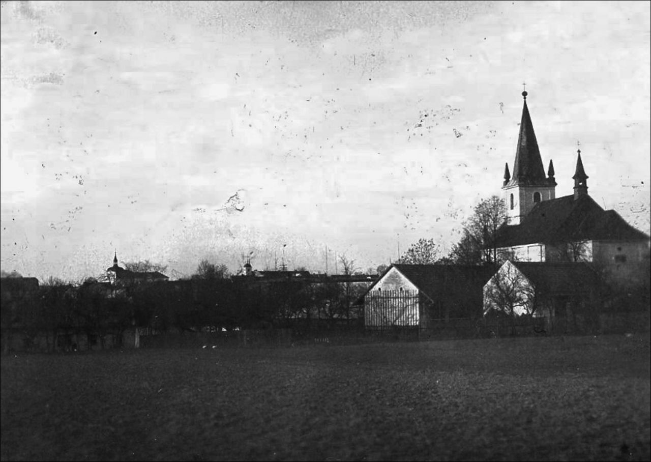Pohled na kostel, školu a radnici