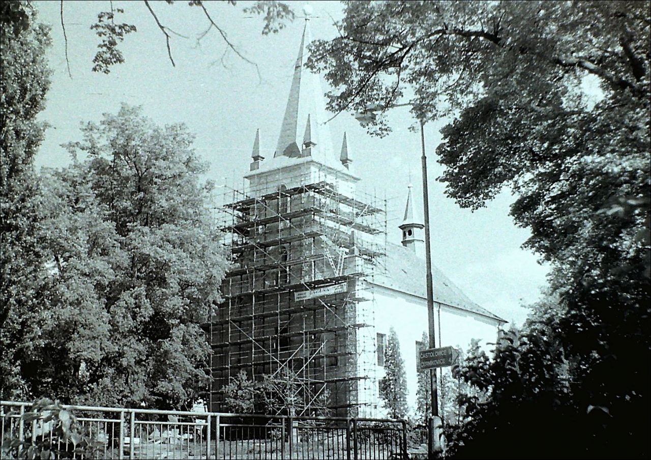 Oprava fasády na farním kostele v roce 1994