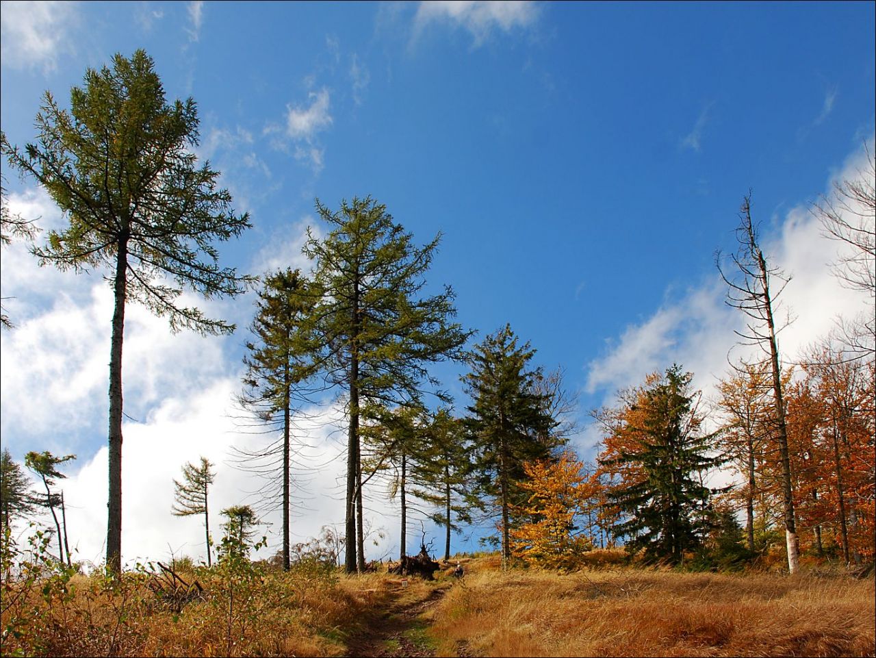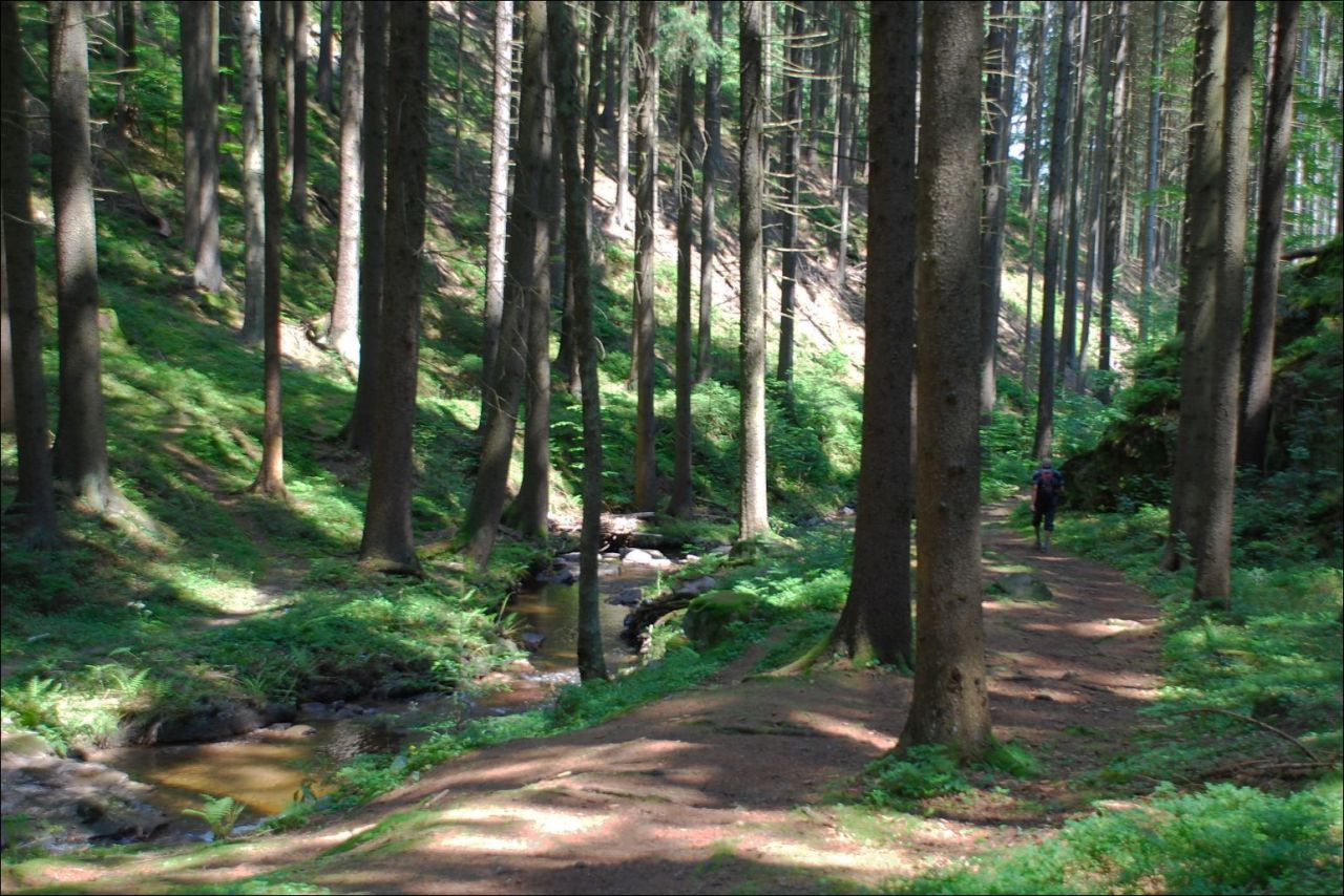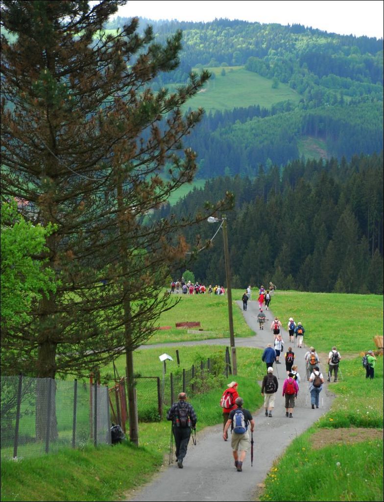 Zájezd KČT Solnice do Slezských Beskyd Hrčava -sestupujeme k česko-polsko- slovenské hranici.