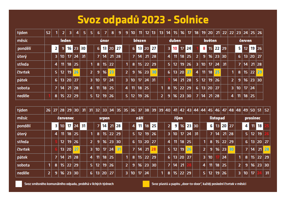 Od 1.1.2023 bude svozovým dnem komunálního odpadu v Solnici liché pondělí.