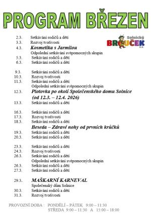 Solnický Brouček představuje svůj program na měsíc březen 2026.