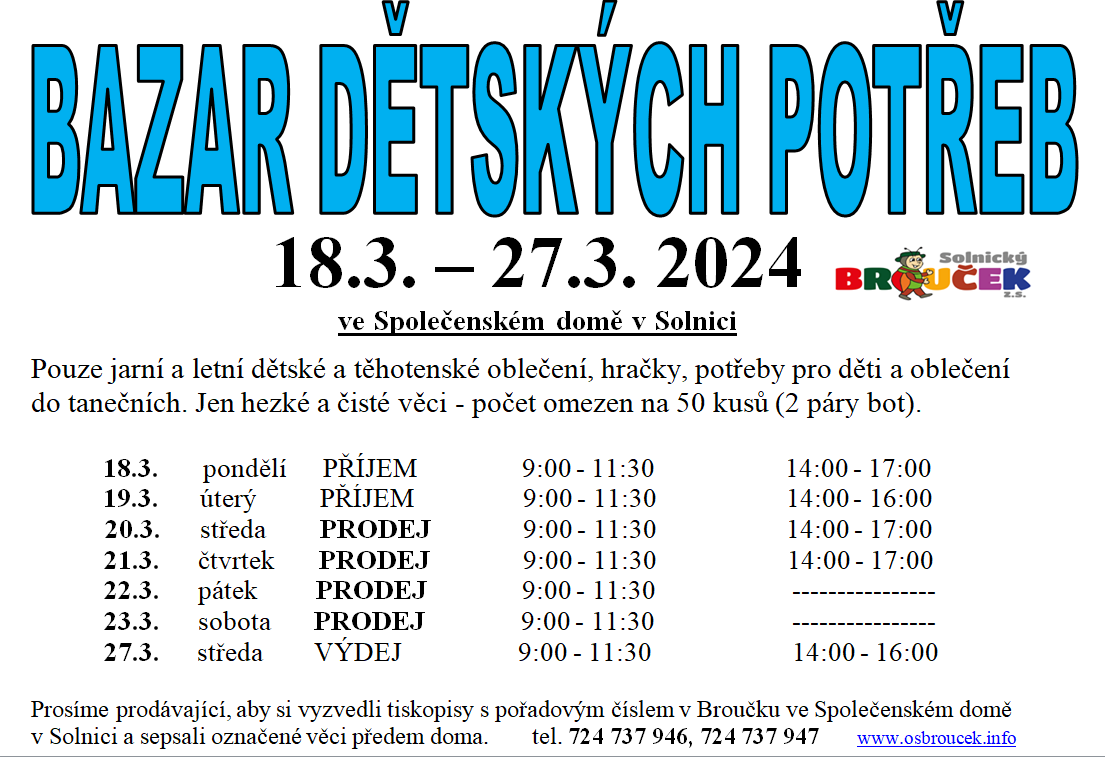 Solnický Brouček pořádá tradiční bazar, tentokrát zaměřený na jarní a letní dětské a těhotenské oblečení, hračky, potřeby pro děti a oblečení do tanečních.
