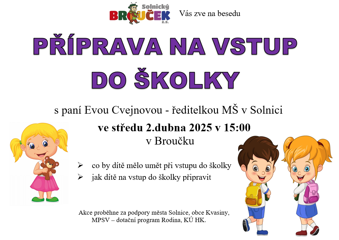 BROUČEK Vás zve na besedu PŘÍPRAVA NA VSTUP DO ŠKOLKY s paní Evou Cvejnovou - ředitelkou MŠ v Solnici. Akce se uskuteční ve středu 2. dubna 2025 v 15:00 v Broučku. Dozvíte se, co by dítě mělo umět při vstupu do školky a jak ho na tento krok připravit. Akce proběhne za podpory města Solnice, obce Kvasiny, MPSV - dotační program Rodina, KÚ HK.
