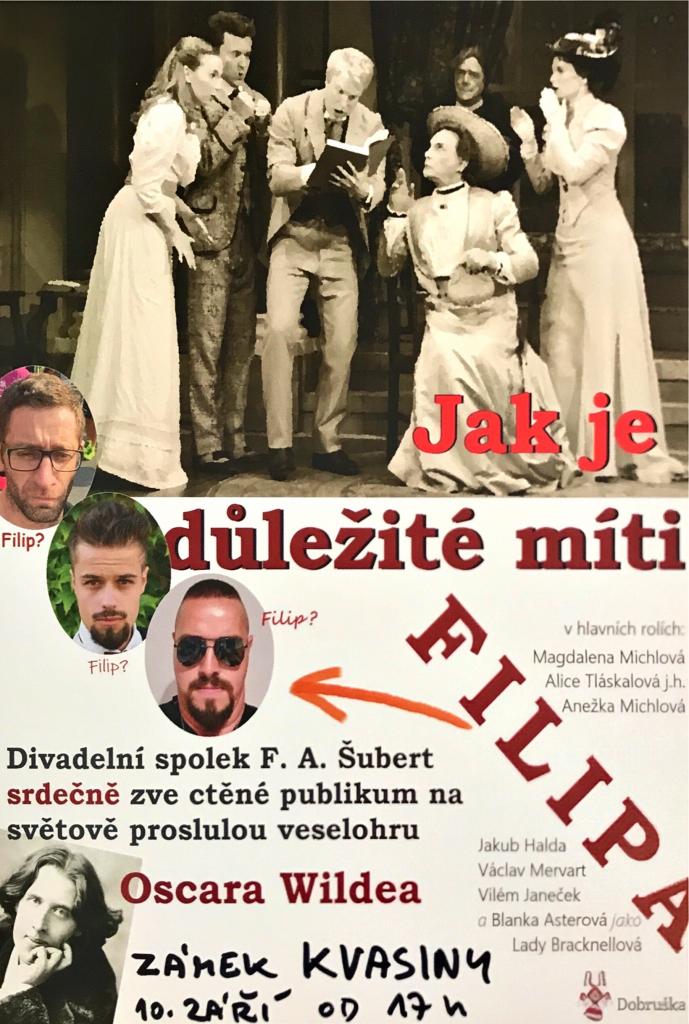 Divadelní spolek F. A. Šubert zve na veselohru Oscara Wildea Jak je důležité míti Filipa.