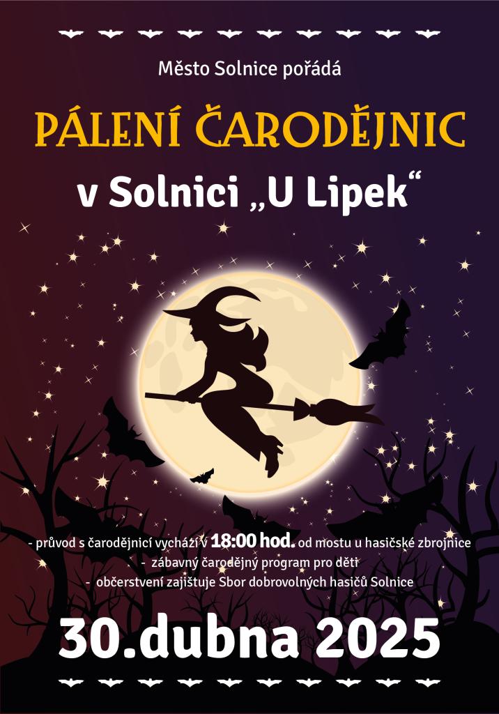 Město Solnice zve všechny na tradiční Pálení čarodějnic, které se uskuteční 30. dubna 2025. Čeká vás průvod s čarodějnicí a zábavný program pro děti, občerstvení zajišťuje Sbor dobrovolných hasičů Solnice.