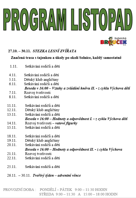 Solnický Brouček představuje svůj program na měsíc listopad 2024.