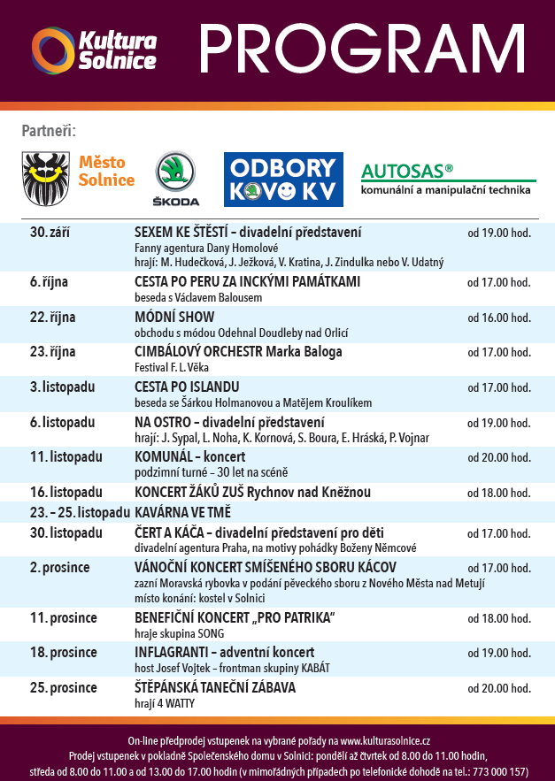 Kultura Solnice s.r.o. představuje program na podzim 2022.