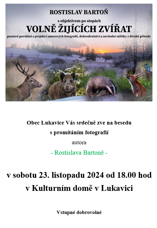Srdečně zveme na besedu s Rostislavem Bartoněm, která proběhne 23. listopadu 2024 od 18:00 v Kulturním domě v Lukavici. Představíme si jeho úžasné fotografie a dobrodružství z volné přírody. Vstupné je dobrovolné.