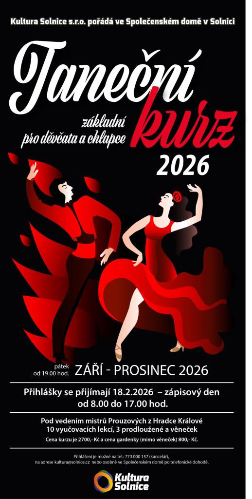 Kultura Solnice s.r.o. pořádá ve Společenském domě Solnice základní Taneční kurz 2026 pro děvčata a chlapce, který se uskuteční od září do prosince 2026. Zápisový den 18.02.2026.