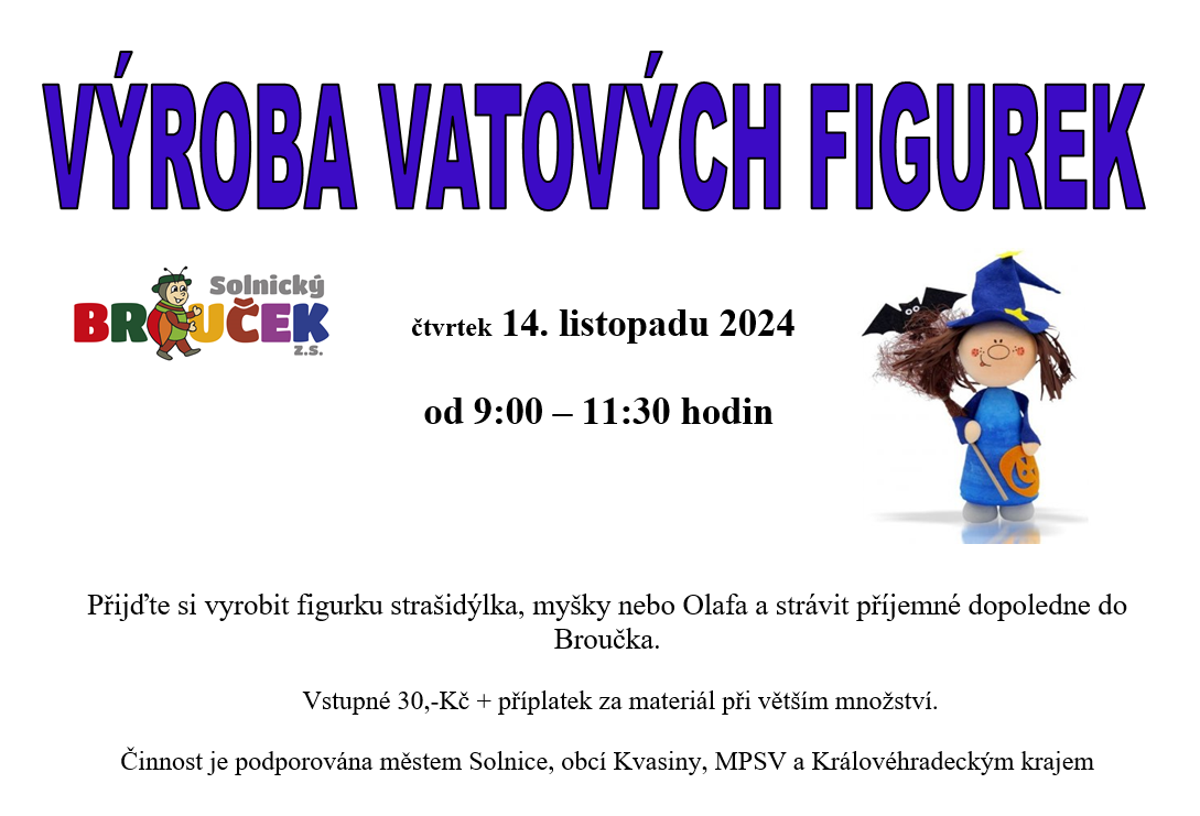 Workshop na výrobu vatových figurek se koná ve čtvrtek 14. listopadu 2024 od 9:00 do 11:30 hodin v Broučku. Účastníci si mohou vyrobit figurku strašidýlka, myšky nebo Olafa a užít si příjemné dopoledne. Vstupné činí 30 Kč, k tomu je příplatek za materiál při větším množství. Akce je podporována městem Solnice, obcí Kvasiny, MPSV a Královéhradeckým krajem.