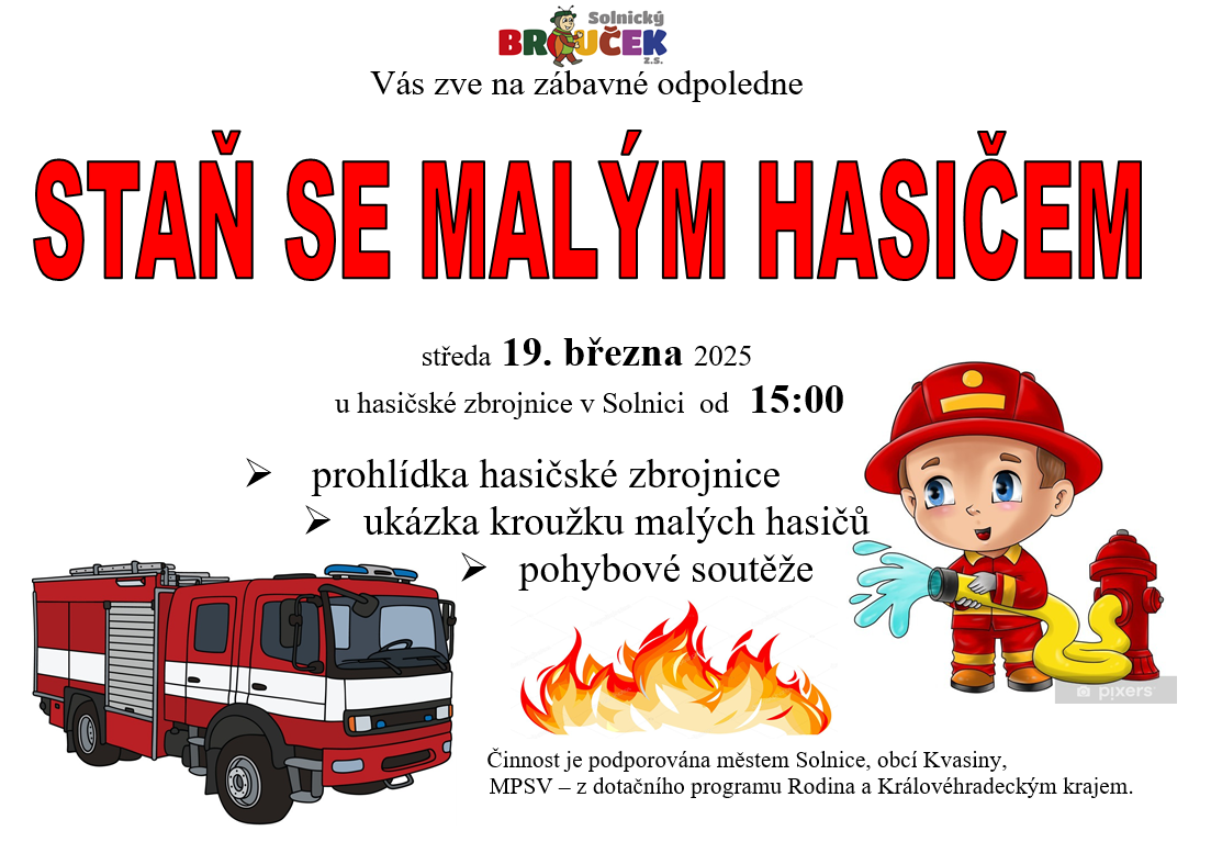 Zveme vás na zábavné odpoledne u hasičské zbrojnice v Solnici, které se koná ve středu 19. března 2025 od 15:00. Na programu je prohlídka hasičské zbrojnice, ukázka kroužku malých hasičů a pohybové soutěže. Akce je podporována městem Solnice, obcí Kvasiny a Královéhradeckým krajem.