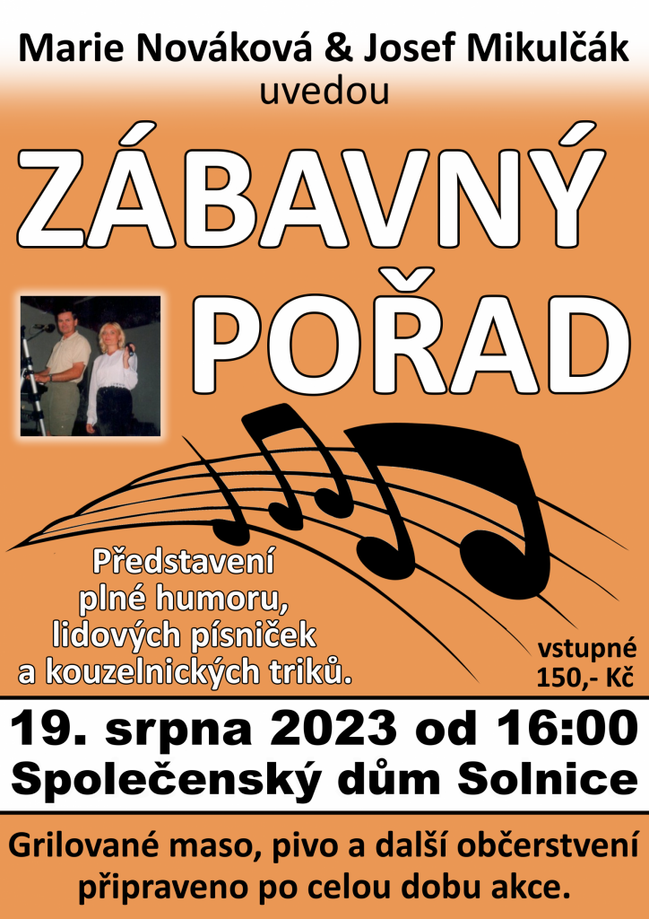 Marie Nováková a Josef Mikulčák uvedou Zábavný pořad - představení plné humoru, lidových písniček a kouzelnických triků.