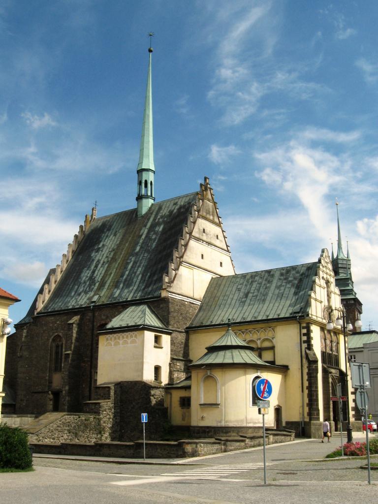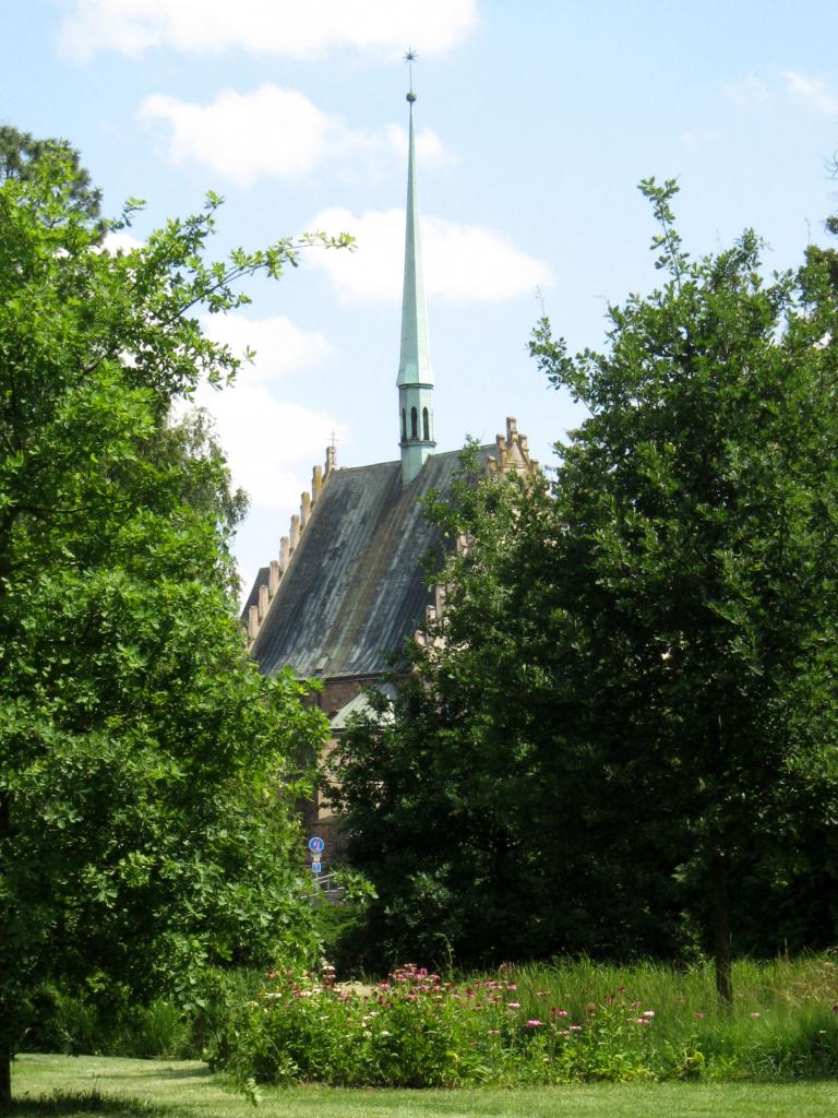 Pohled na kostel sv. Bartoloměje z Tyršových sadů.