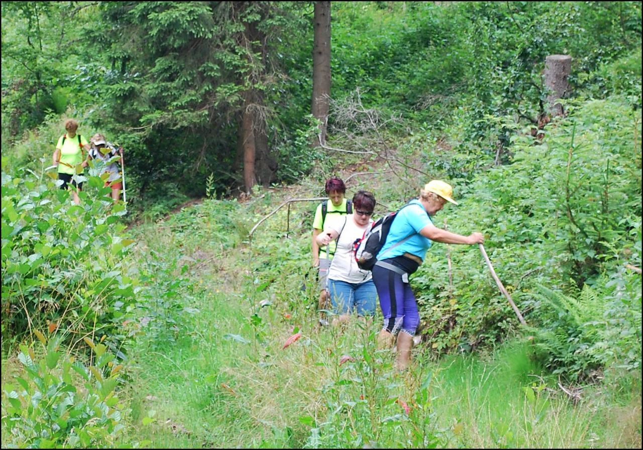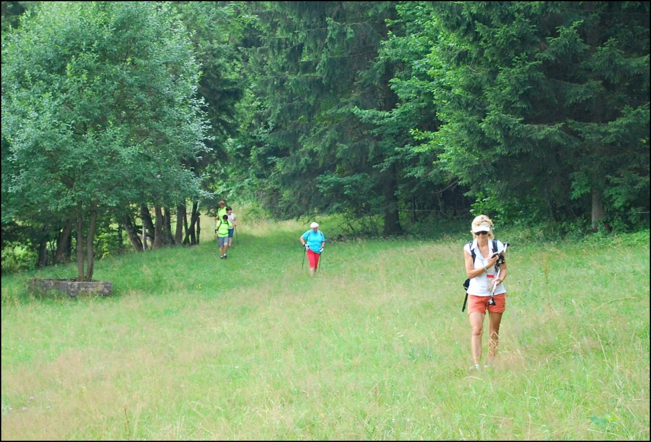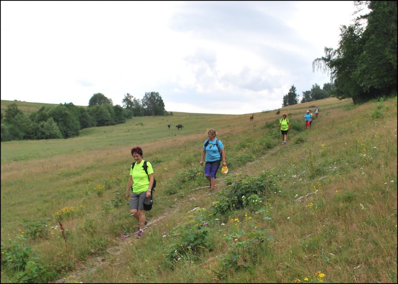 Od nádraží vyrážíme pozvolným stoupáním po zemědělské cestě na hraniční hřeben k polské hranici. Druhá strana je úplně jiná, lesnatá, cesty prudce klesají různými údolími a stržemi. Před vesnicí už jdeme po loukách, zrytých divokými prasaty, na kterých se pasou koně. Byla to krásná cesta divočinou.