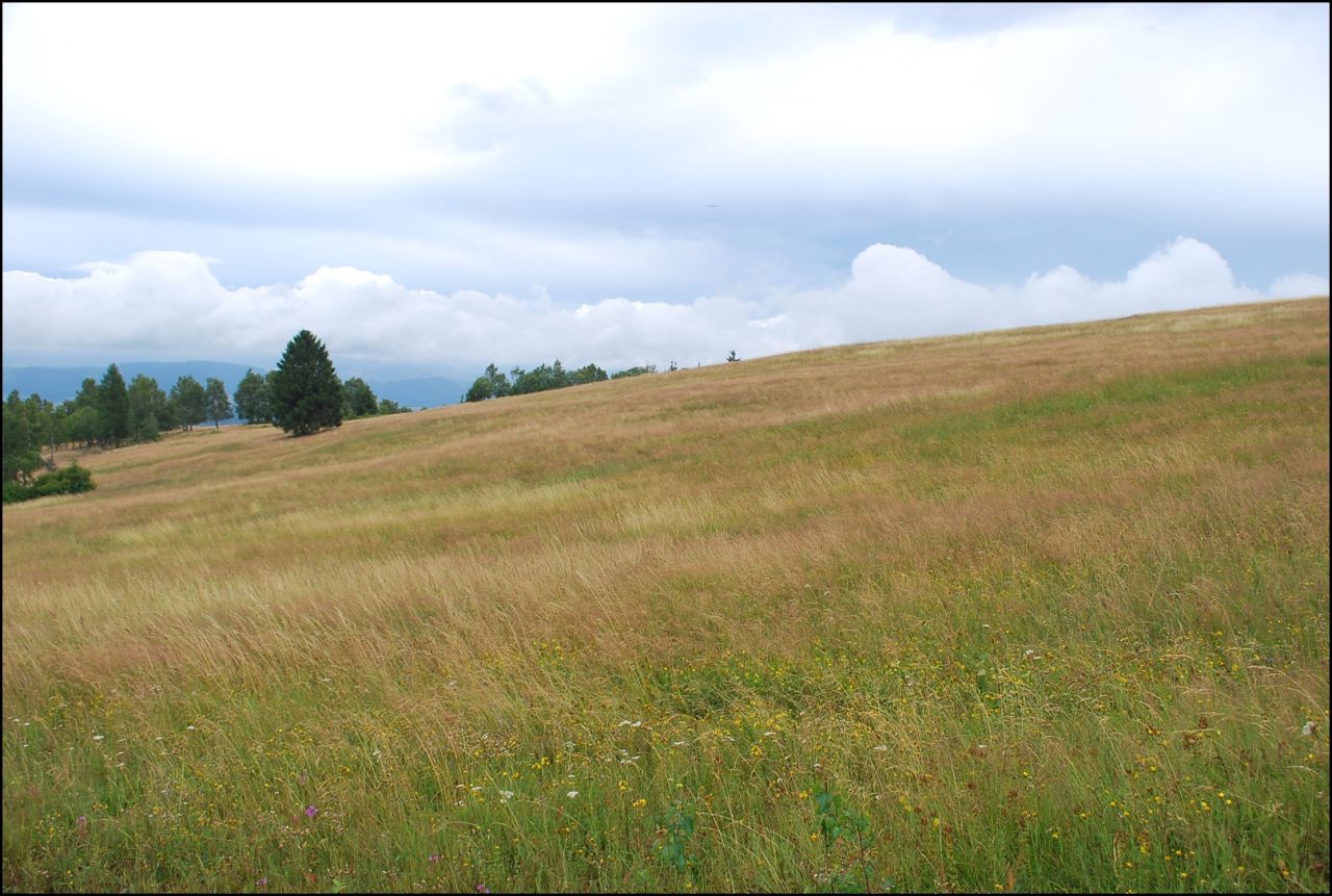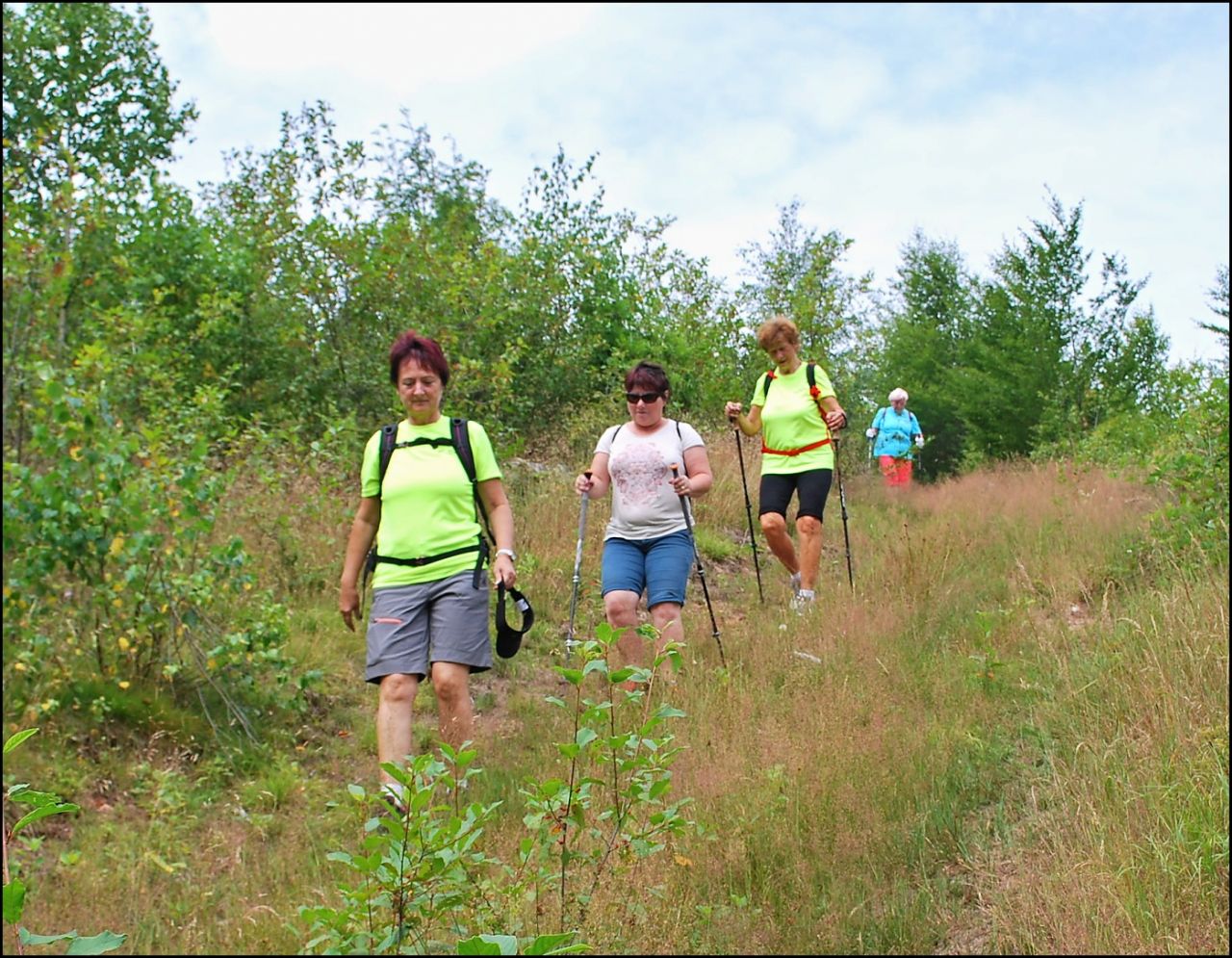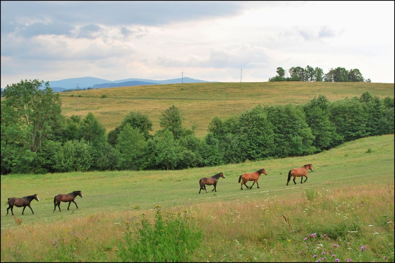 Od nádraží vyrážíme pozvolným stoupáním po zemědělské cestě na hraniční hřeben k polské hranici. Druhá strana je úplně jiná, lesnatá, cesty prudce klesají různými údolími a stržemi. Před vesnicí už jdeme po loukách, zrytých divokými prasaty, na kterých se pasou koně. Byla to krásná cesta divočinou.