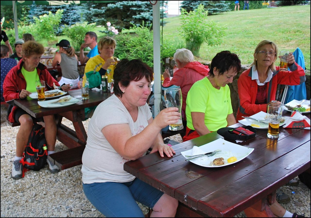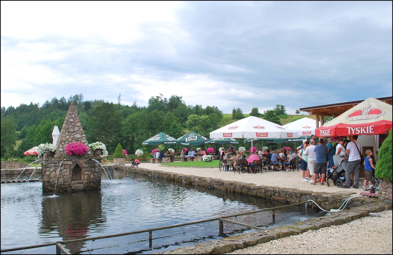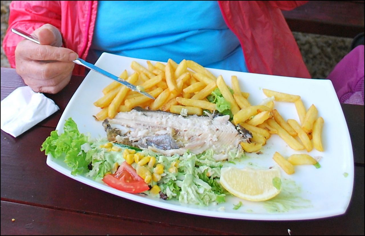 Na rybí farmě je už na začátku otevírací doby spousta návštěvníků, hodně českých, ale objednávka smaženého pstruha s přílohou a pivem probíhá v poklidu a ani pak dlouho nečekáme. Jsou na velký zájem návštěvníků dobře připraveni. Pod plachtami slunečníků zde přečkáváme prudký déšť.