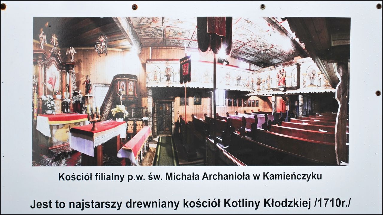 Spokojeni pak stoupáme vesnicí[JJ1] ke kostelu sv. Michala Archanděla. Kostel je to starý, dřevěný ze začátku 18. století, bohužel nepřístupný, ale aspoň fotka ukazuje, jak vypadá uvnitř.