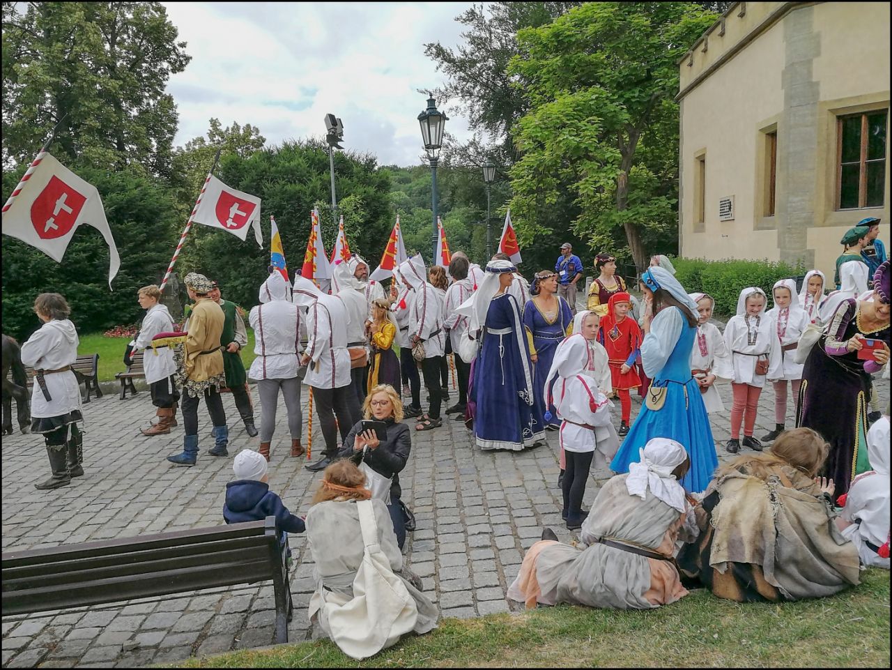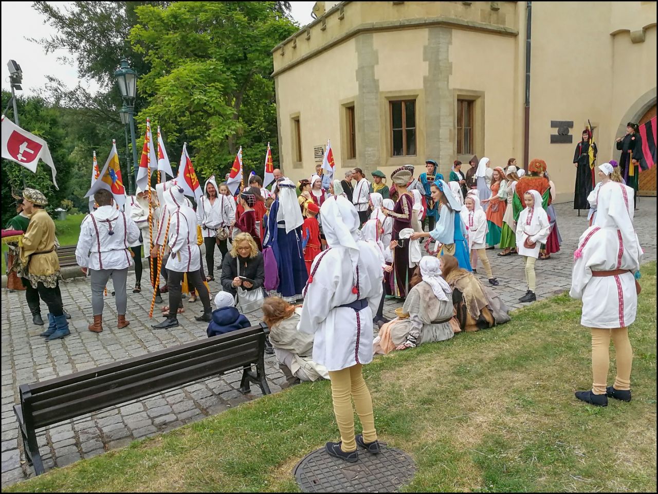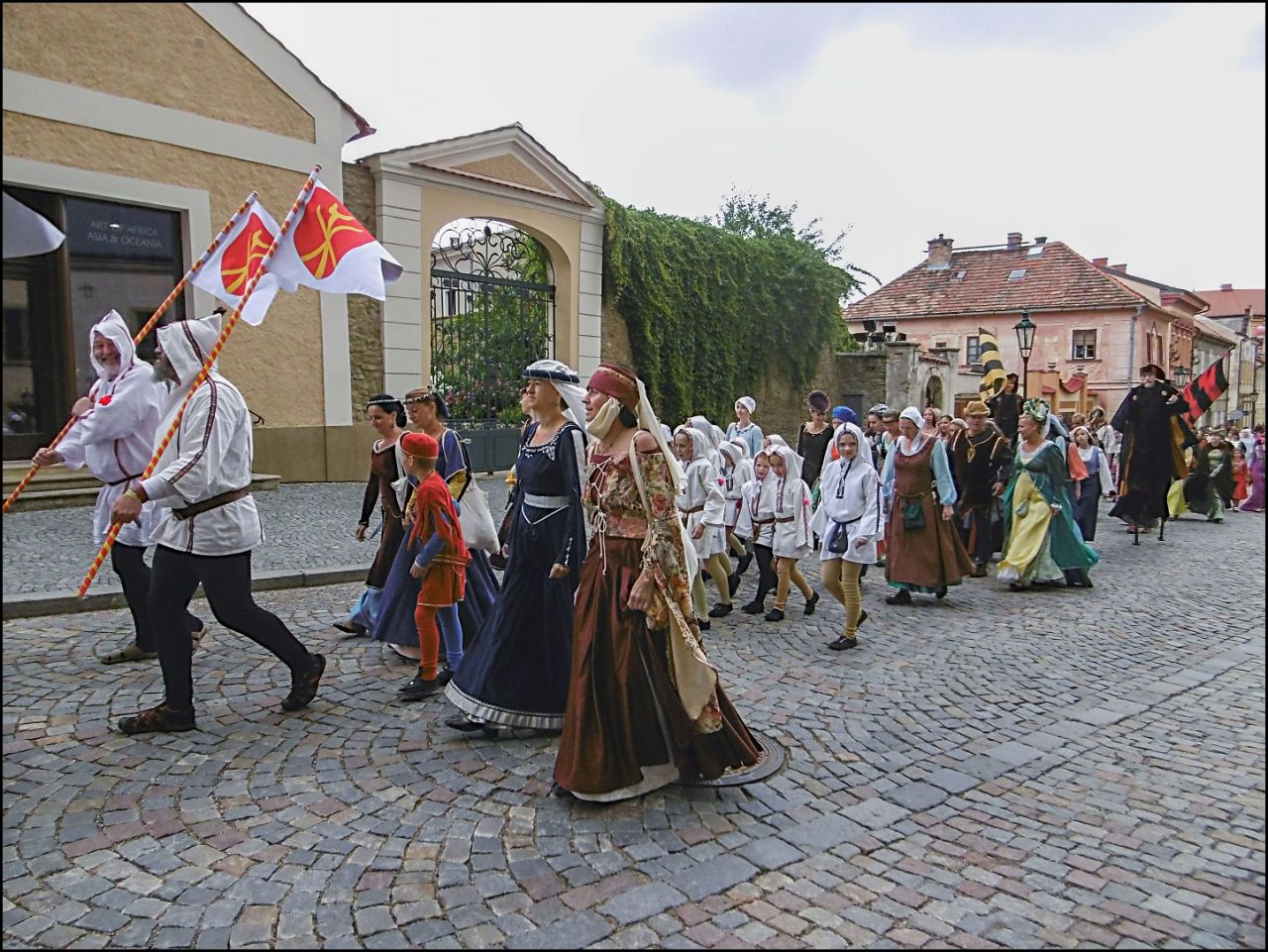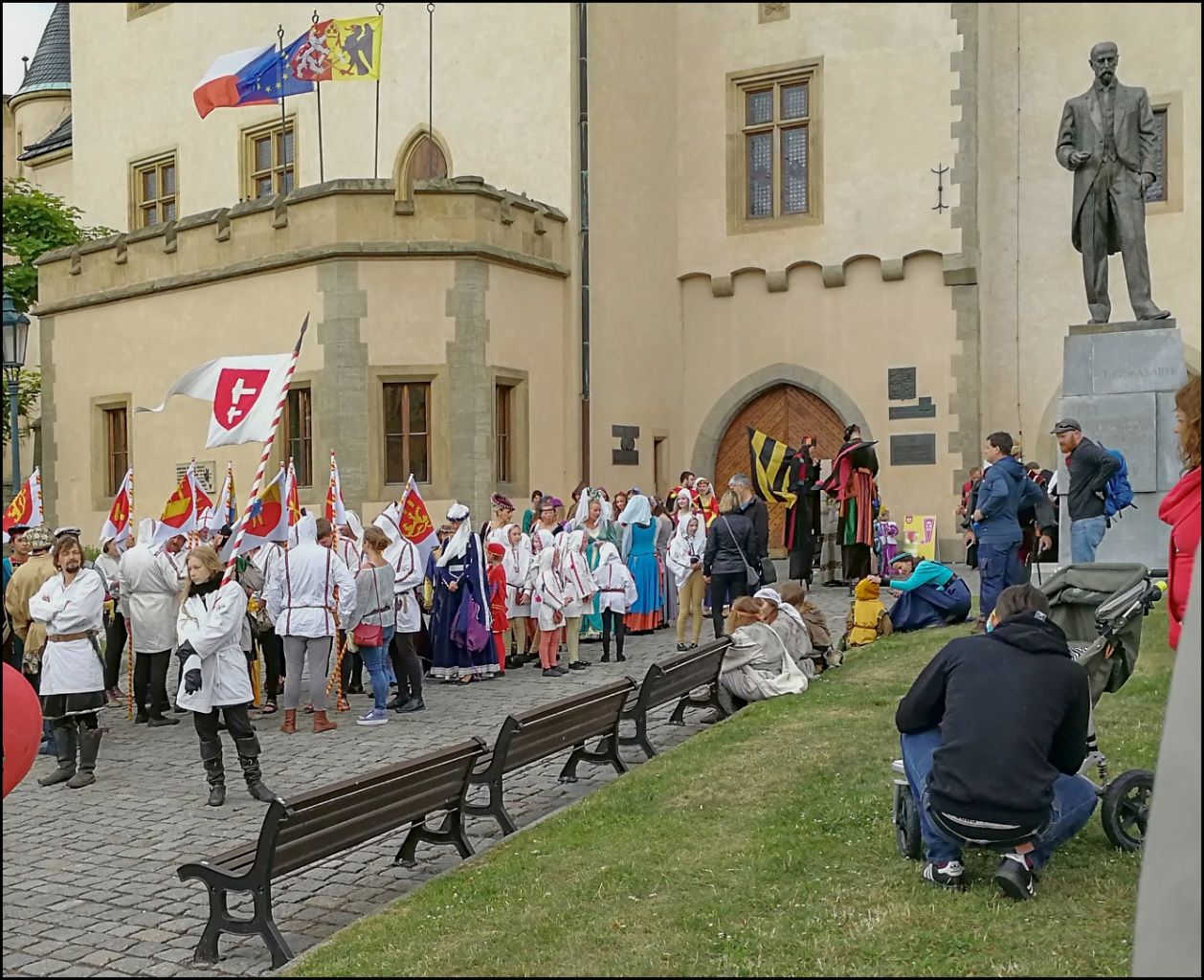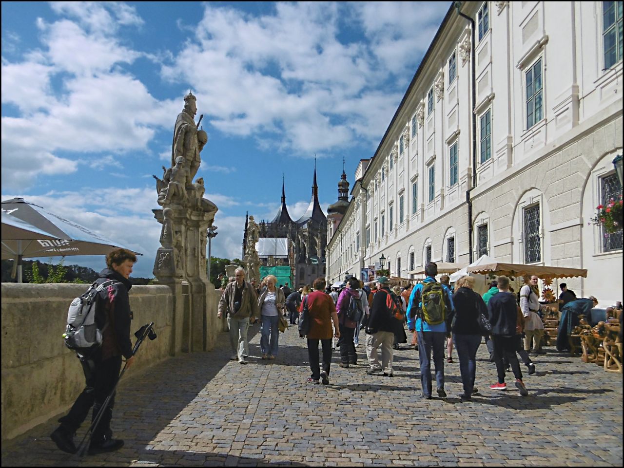 Parkujeme u nádraží a hned na náměstí zjišťujeme, že v Kutné Hoře je „Stříbrobraní“ s průvodem. Fotíme průvod, jezdce na koních ve středověkých oděvech, havíře v oděvech 14.století, dívky s čepci, další na chůdách. Připojujeme se k průvodu.