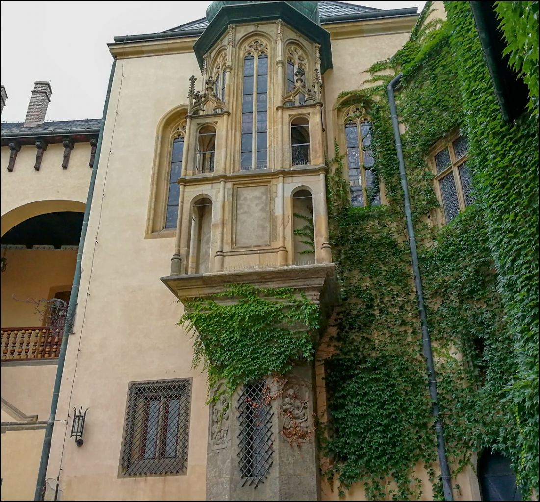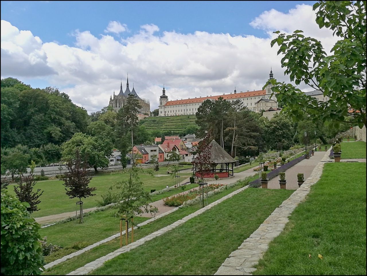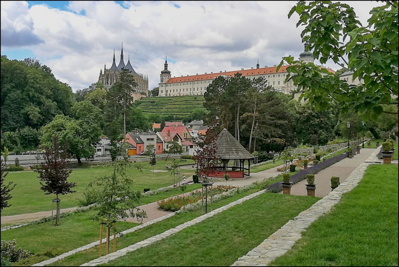 Krásné zahrady, výhledy na Barboru, jezuitskou kolej. Obdivujeme stavitele teras. První část trasy jde lesem pod tratí, obdivujeme stromy ovinuté břečťanem. Relief Vrchlického nám objasňuje, proč se jmenoval Vrchlický. I Tyl zde snad psal text hymny. Přecházíme silnici, jdeme nad Vrchlicí.