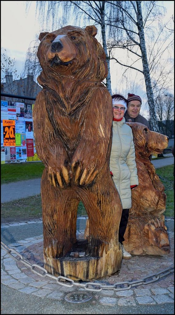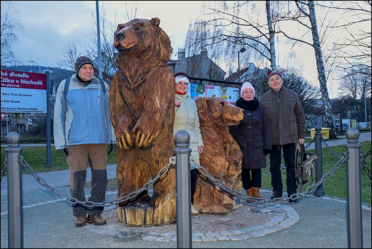 V Náchodě se scházíme na autobusovém nádraží v 9,30. Je nás jenom 5. Počasí je nevalné, zataženo, mlhavo, ale neprší. Naším cílem je prohlédnout si vánočně vyzdobené město. Hned u nádraží nás vítají sochy „náchodských medvědů“ Ludvíka a Dáši, vyřezané ze dřeva. Sochy jsou pěkné, líbí se nám a fotíme se u nich.