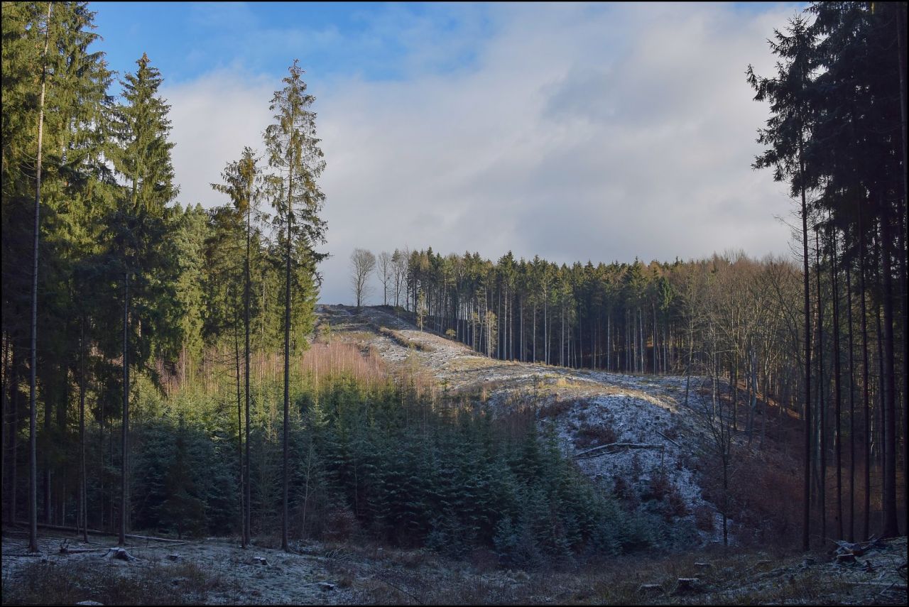 Když vyjdeme nahoru z lesa, začíná se vyjasňovat a objevuje se sluníčko. Otvírají se nám nádherné výhledy na okolní kopce – obdivujeme a kocháme se.