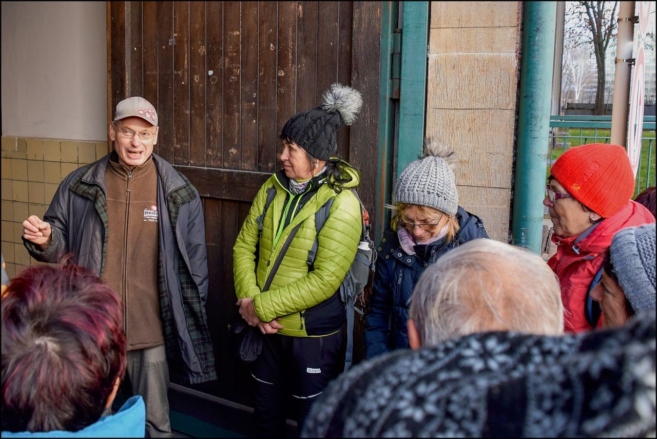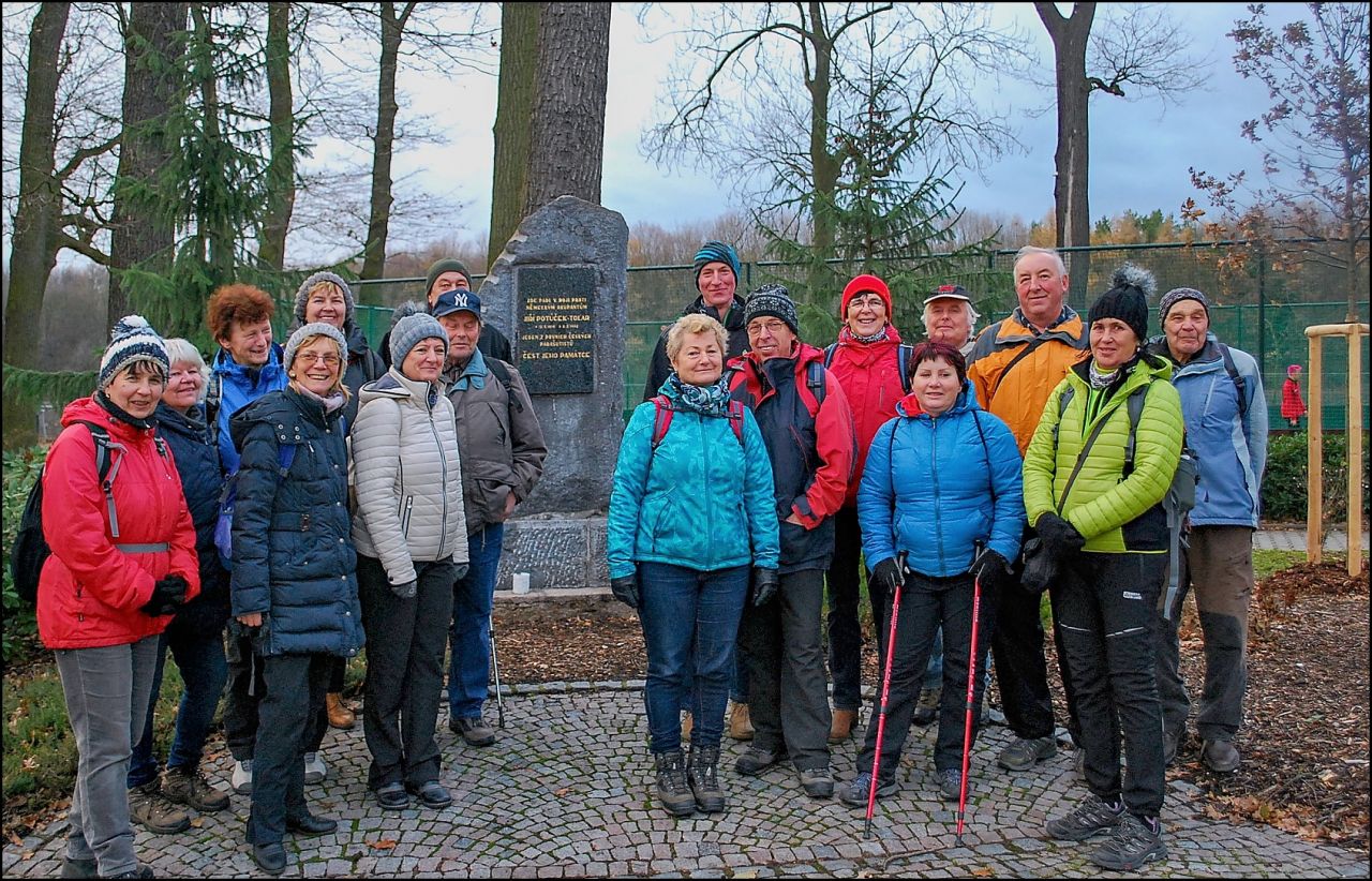 Poté jsme se přesunuli do pivovarské restaurace. Po nekonečném čekání na předem objednaný oběd jsme krátce před druhou hodinou mohli vyrazit k turistickým cílům. Cesta vedla přes sídliště Polabiny k lesoparku Jiřího Potůčka, kde jsme se seznámili s historií místa. Jiří Potůček byl za druhé světové války příslušníkem výsadkářské skupiny Silver A a nedaleko odtud zastřelen.