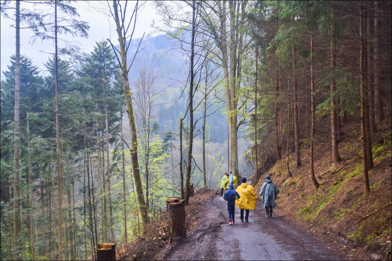 Jedeme autobusem směr Nové Město nad Metují a vystupujeme nad Vrchovinami na odbočce na Přibyslav. Prší. Oblékáme pláštěnky. Asi po 20 minutách k naší radosti přestává pršet a otevírají se nám nádherné výhledy na Dobrošov a do kraje.