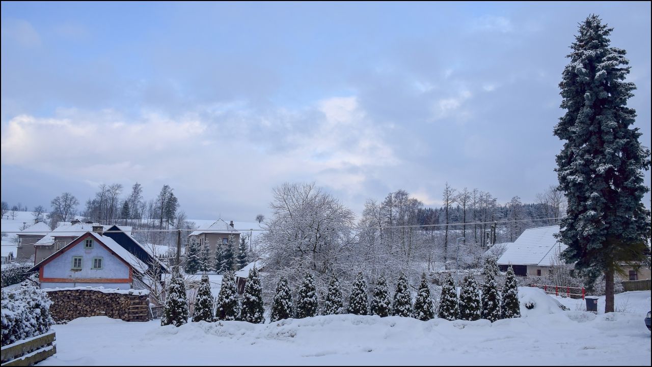 V Houkově chalupy, krásná zvonička, ale dál malebným údolím si cestu musíme prošlapat. Stromy jsou obalené sněhem, je modrá obloha, pěkné.