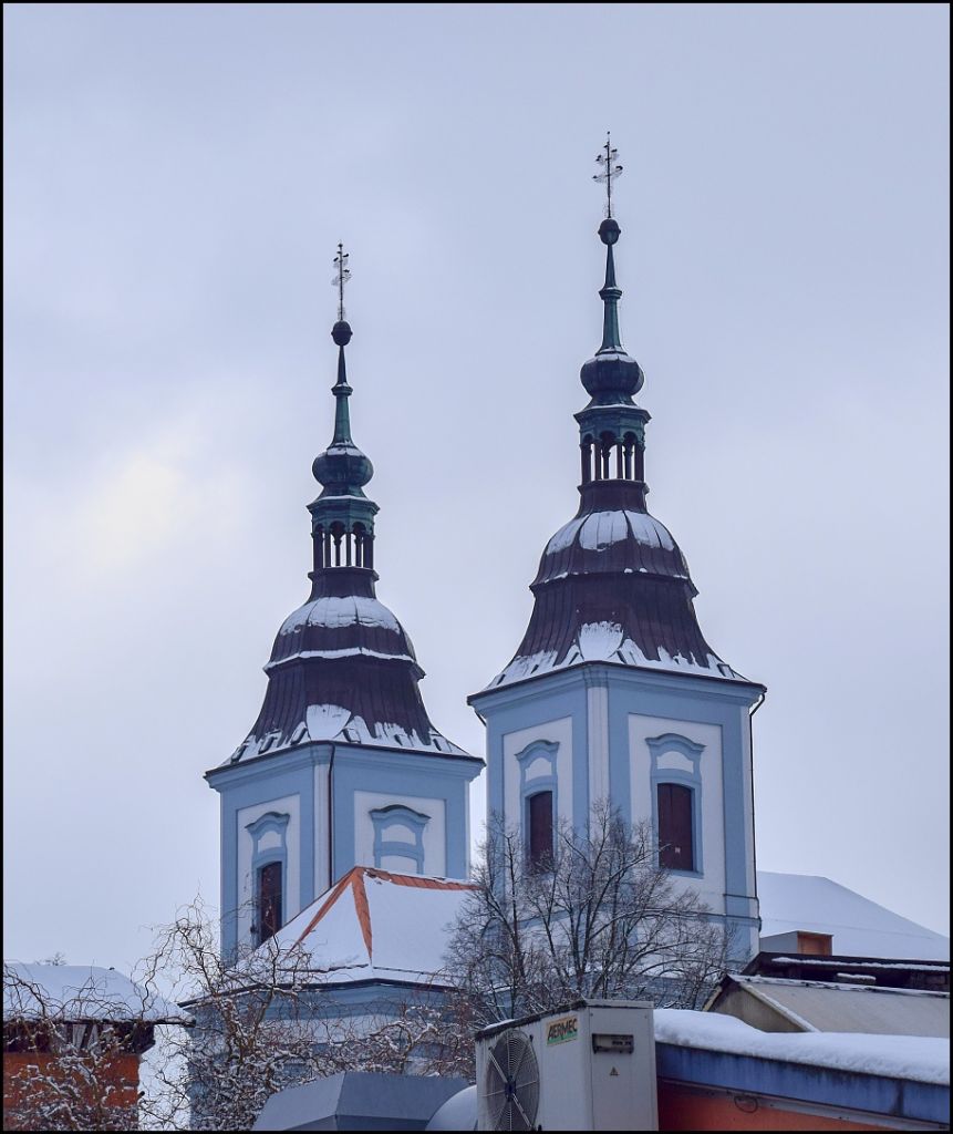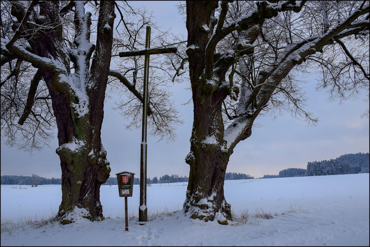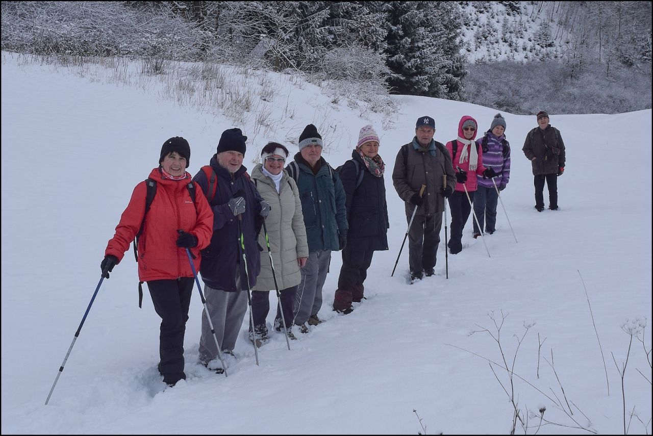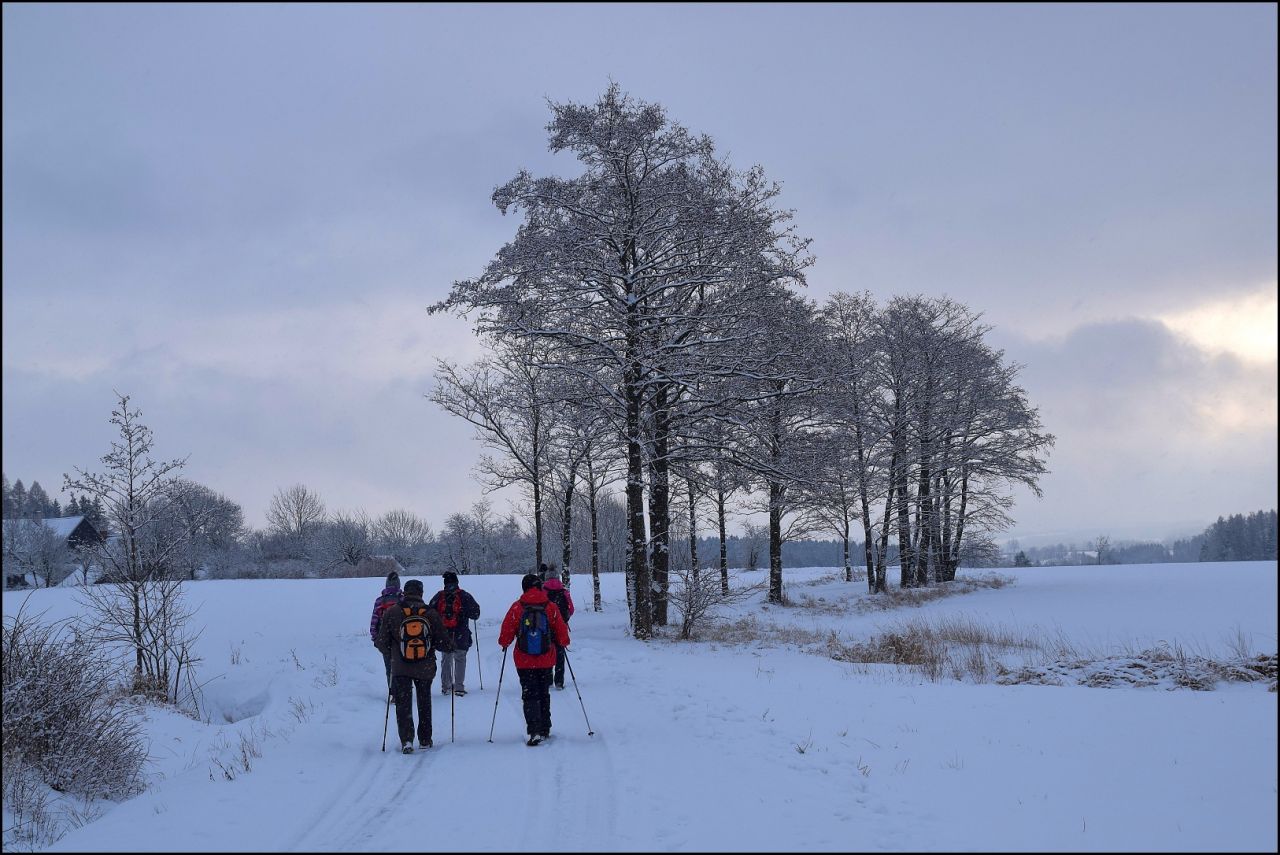 Nejdříve v autobusové čekárně oslavujeme Zdeńka. Paní Věra byla dobře vybavená nejen lahvičkou, ale i skleničkami. Pokračujeme po silnici, přestává sněžit, proti jezdí hodně aut s lyžaři na hory. Kaple Nejsvětější Trojice je uzavřená, tak pokračujeme na odbočku polní cesty s modrou značkou. Cesta do osady Houkov je projetá auty, jde se dobře.