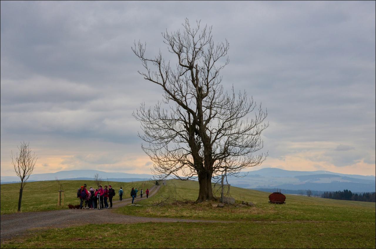 A pak už jsme se všichni vydali po zelené turistické značce směr Rokytnice v O. h. Nejdříve chvíli po silnici, pak po loukách s výhledy, před vstupem do lesa se zrenovovaným křížem jsme udělali další zastávku.