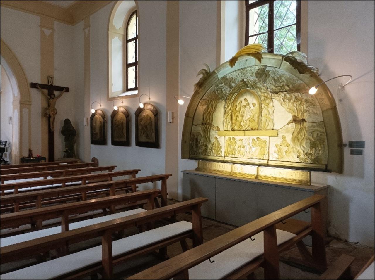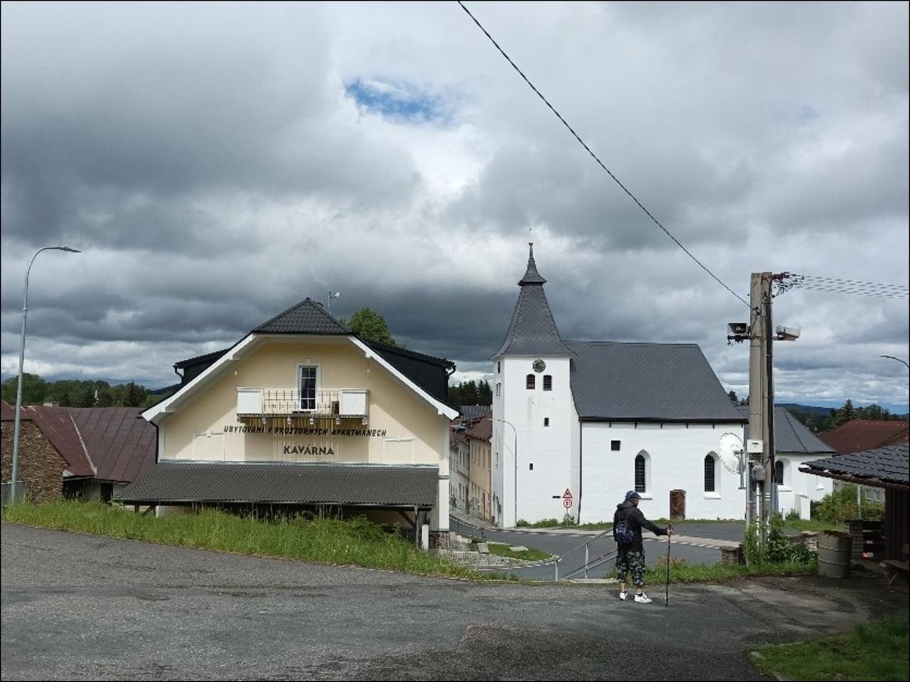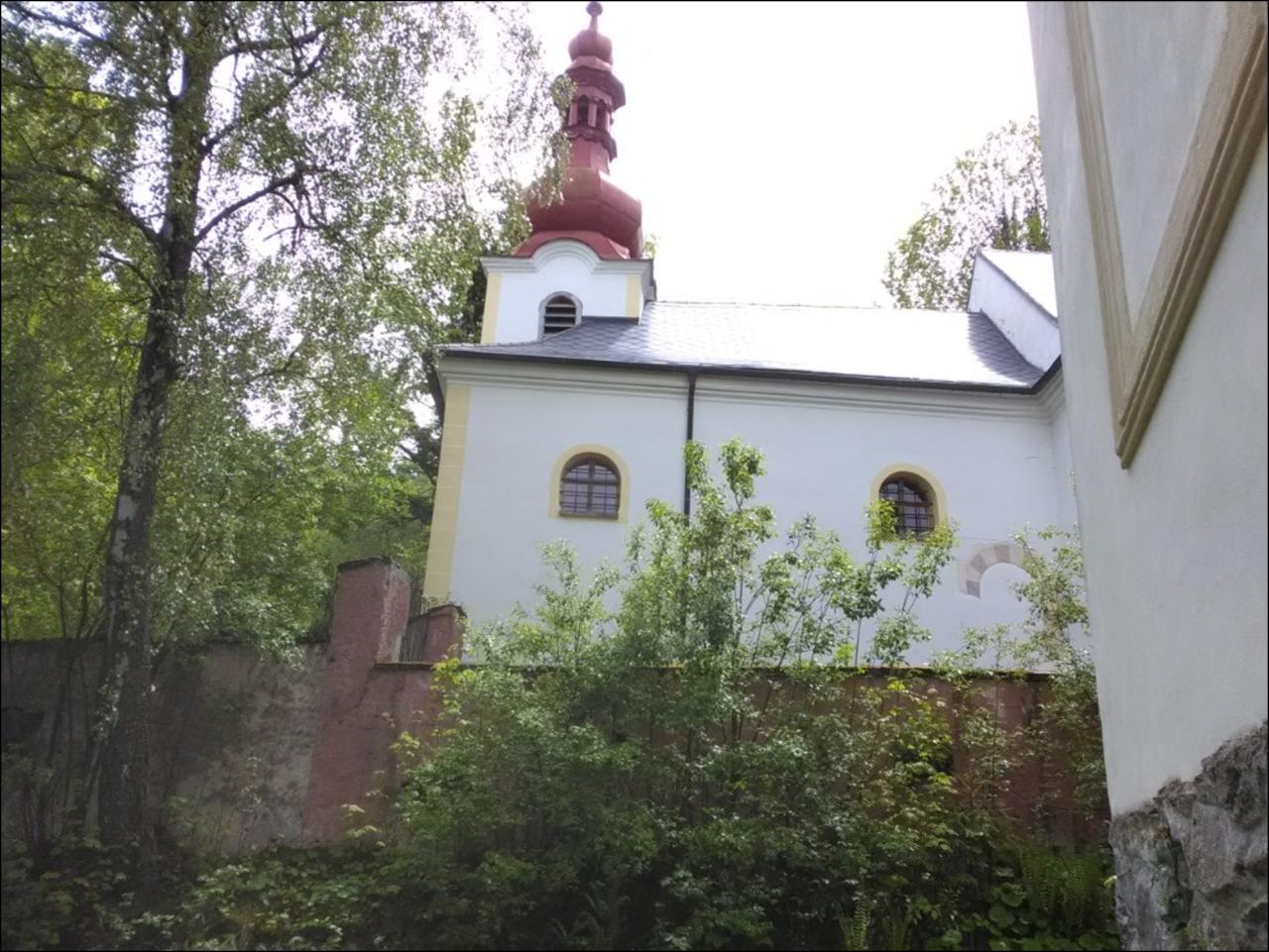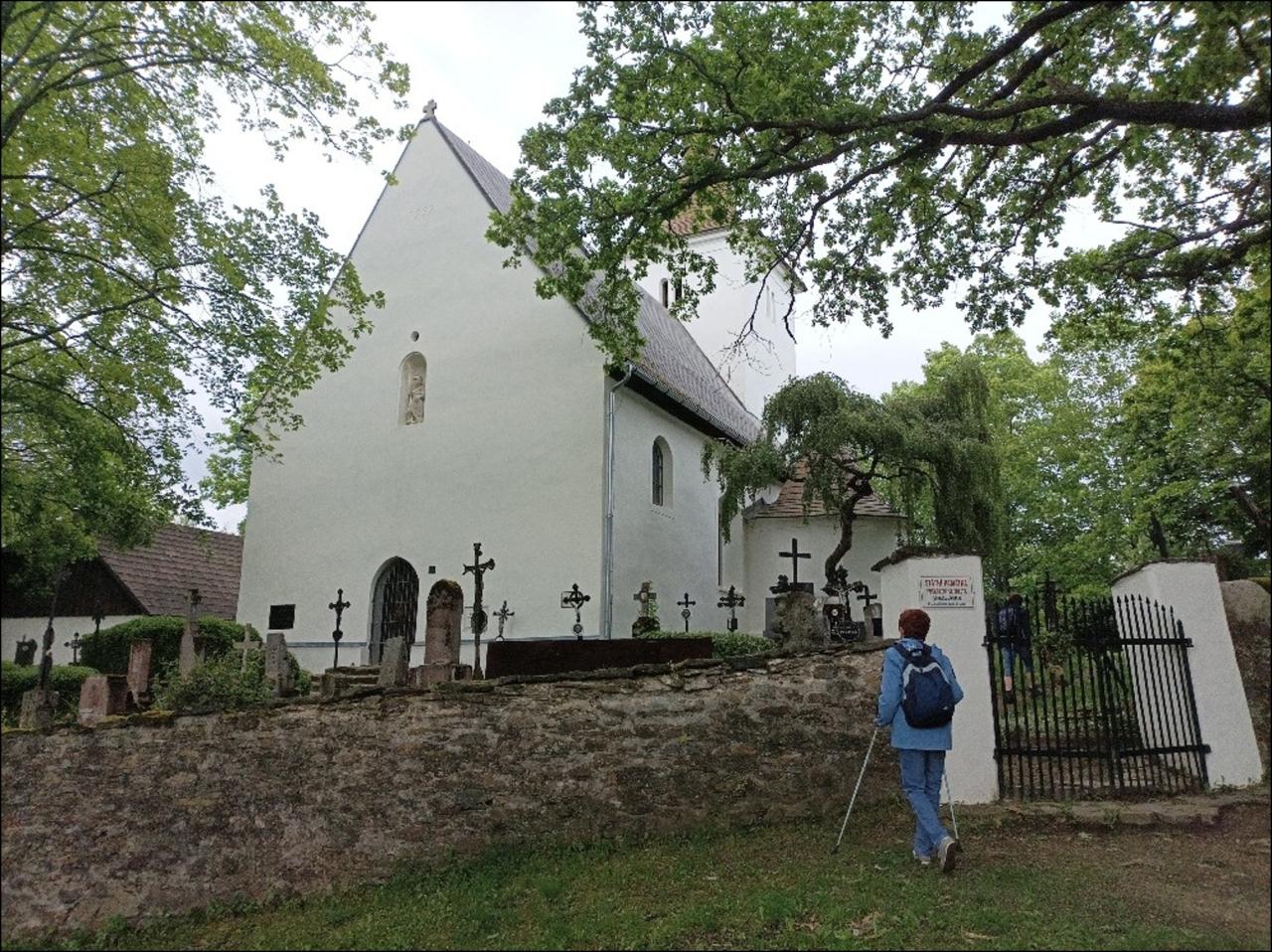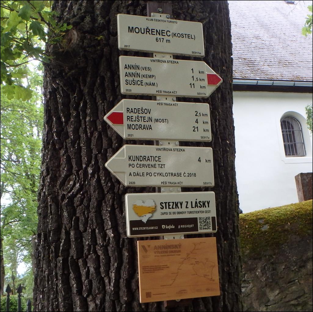 Modrá značka, po které se odtud vydáváme, pak nás dovede kolem kapličky v Hamižné do Hartmanic, kde je možno se občerstvit v hospodě, navštívit obchod nebo si prohlédnout nově obnovenou Horskou synagogu. Po Vintířově stezce pak pokračujeme do Palvínova s hodně devastovaným zámečkem, na kterém je vidět snahu ho opravit. Počasí na pochod je přijatelné, sice chladné, ale neprší a chvílemi probleskne sluníčko. Pak se dostáváme kolem místa nazvaného Švédské hroby k tajemnému kostelu na Mouřenci, sice zavřenému, ale je možné nahlédnout do kostnice na hřbitově.