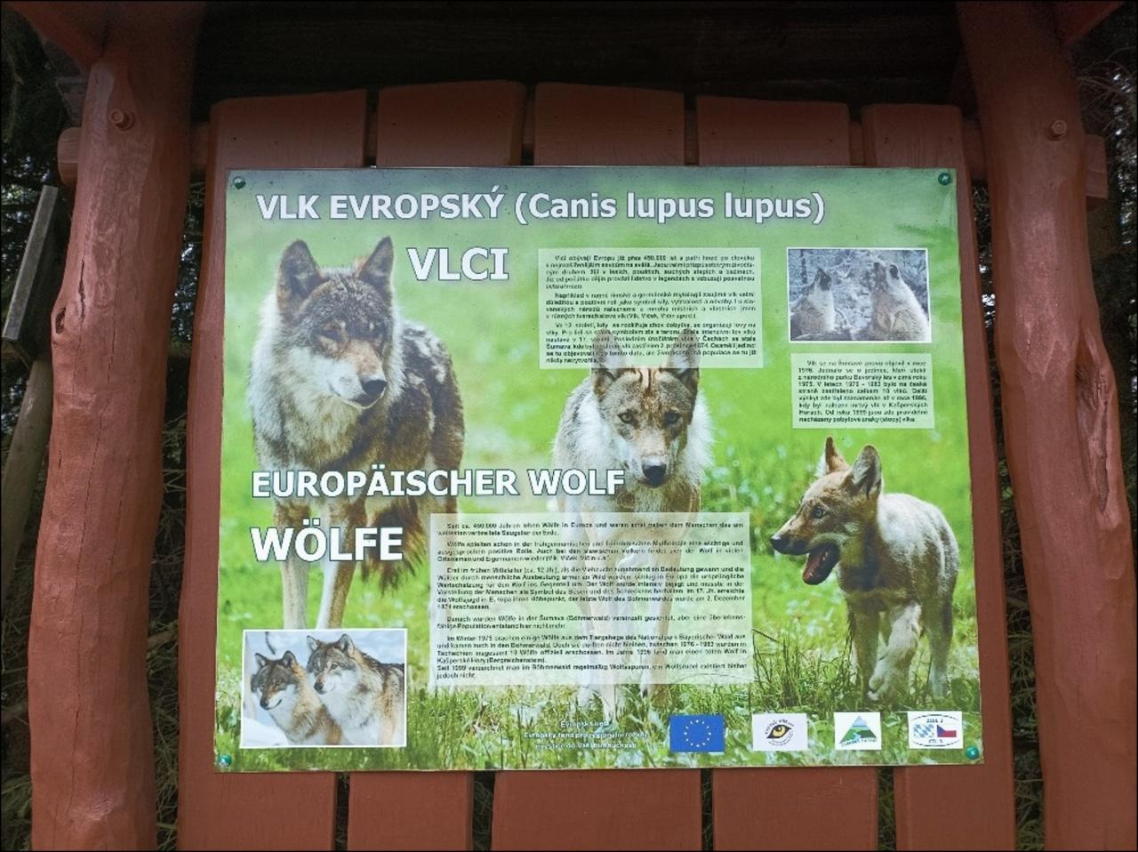 Po obědě se ale počasí výrazně zlepší, vysvitne sluníčko a tak většina zamíří do místního návštěvnického centra Šumavského národního parku, kde se nachází známá Vlčí naučná stezka. A opravdu je možné několik vlků ve velkém výběhu z výšky shlédnout a trochu si představit, jak asi žijí ve volné přírodě.
