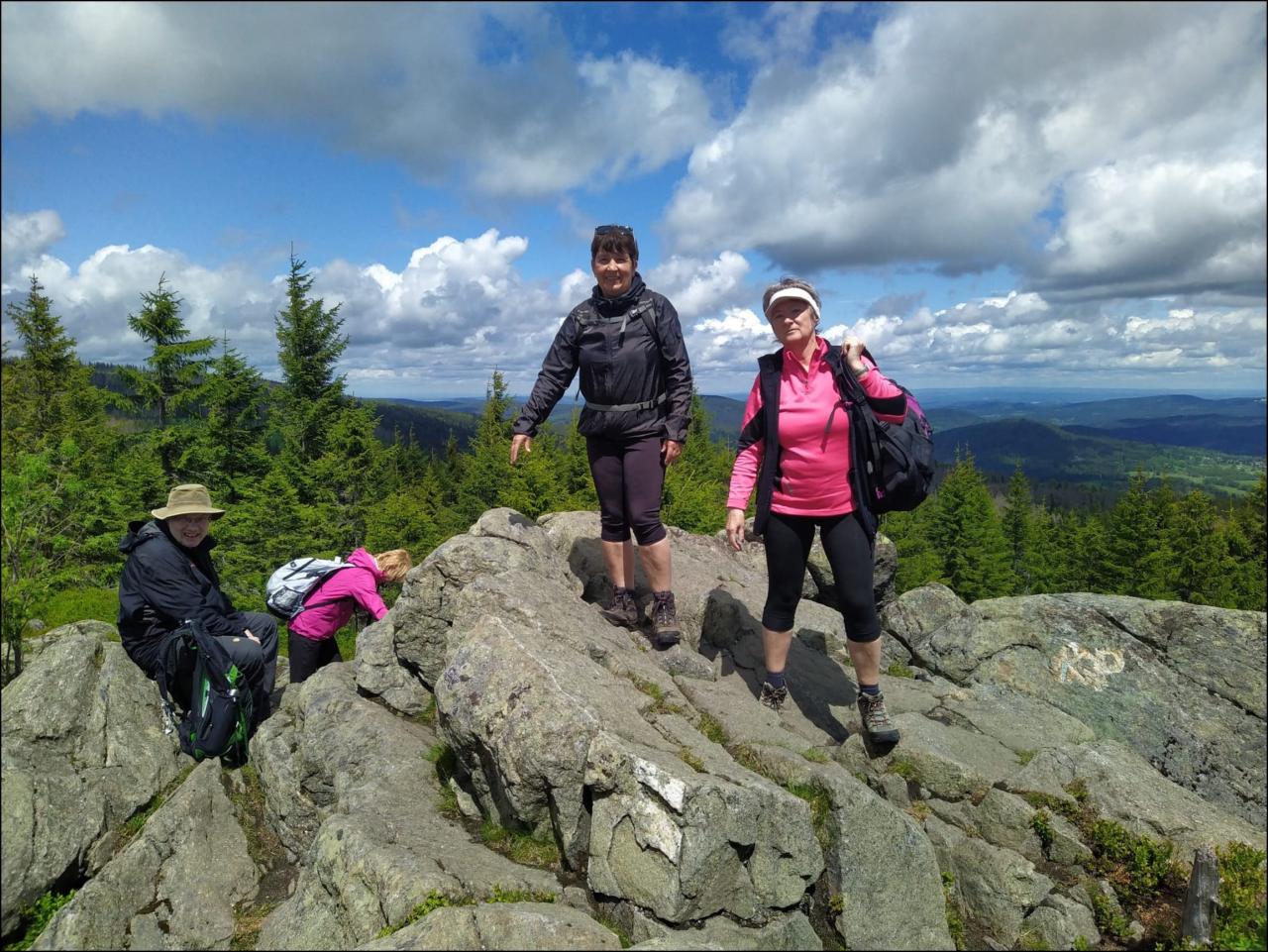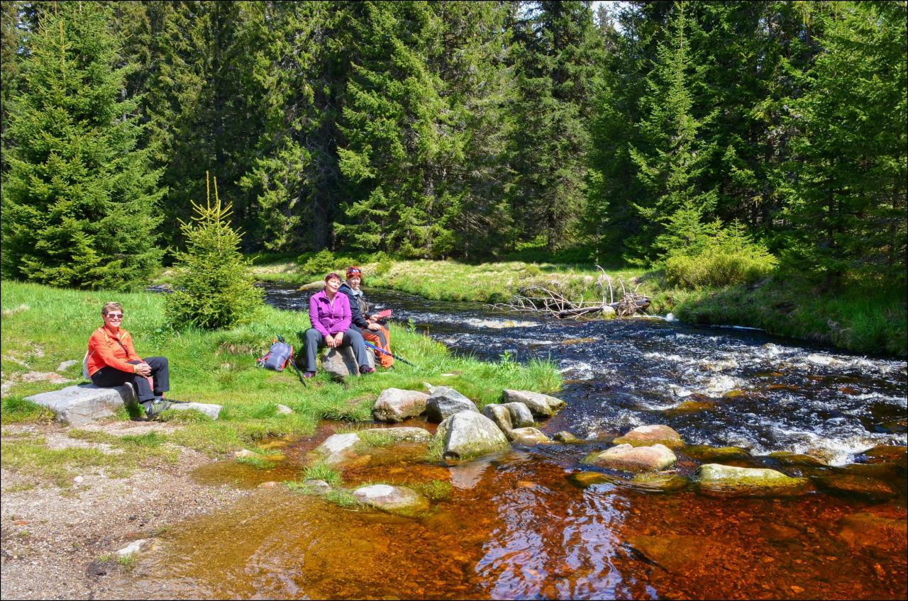 Všichni se pak sejdou většinou v restauraci pivovaru Lyer a nakonec u soutoku Modravského a Roklanského potoka. Někteří zdatní vyjdou z Modravy k Tříjezerní slati a přes vrchol Oblík přes bývalou obec Zelená Hora dojdou až do místa ubytování ve Starém Srní. Počasí nám v tento den přeje a všichni jsou spokojeni s krásnými výhledy.